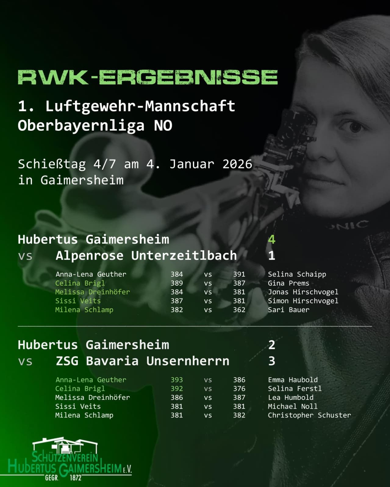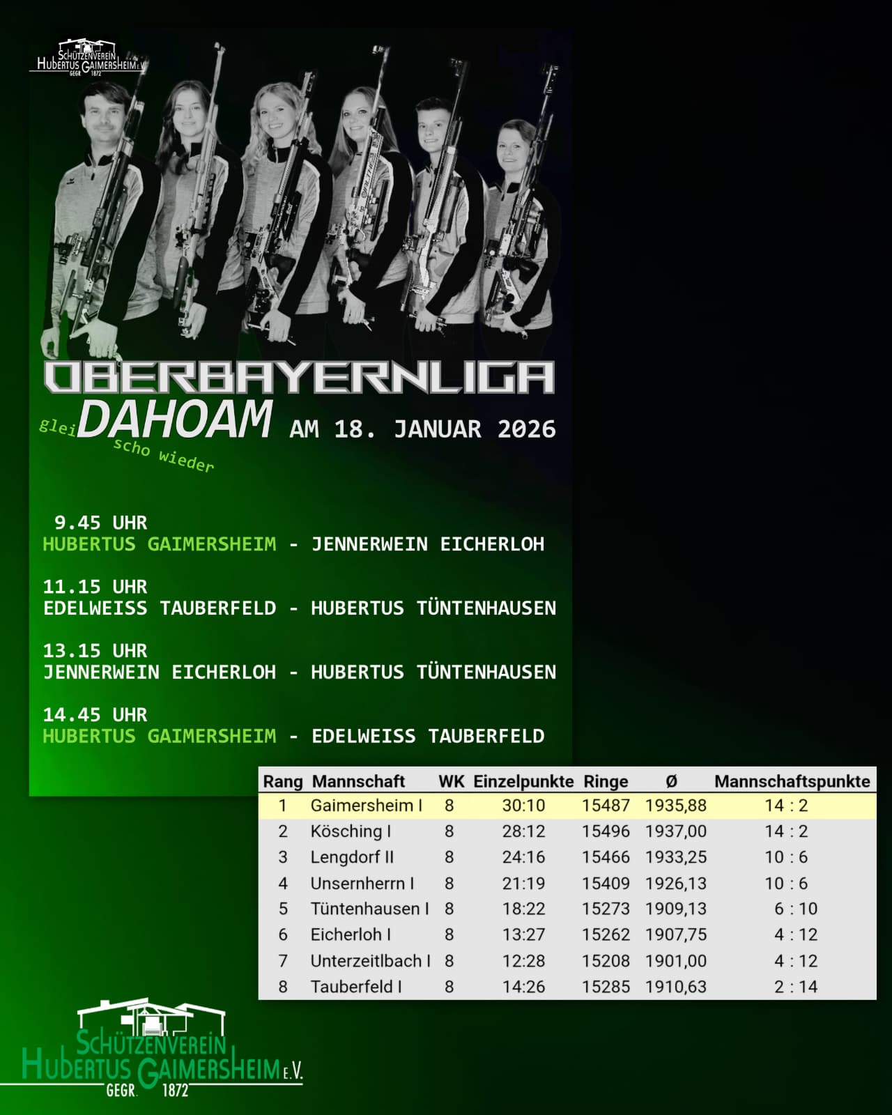 Zum ersten Oberbayernliga-Heimkampf der Saison am 4. Januar waren Alpenrose Unterzeitlbach, Edelweiß Tauberfeld sowie ZSG Bavaria Unsernherrn in unserem gut besuchten Schützenhaus zu Gast.