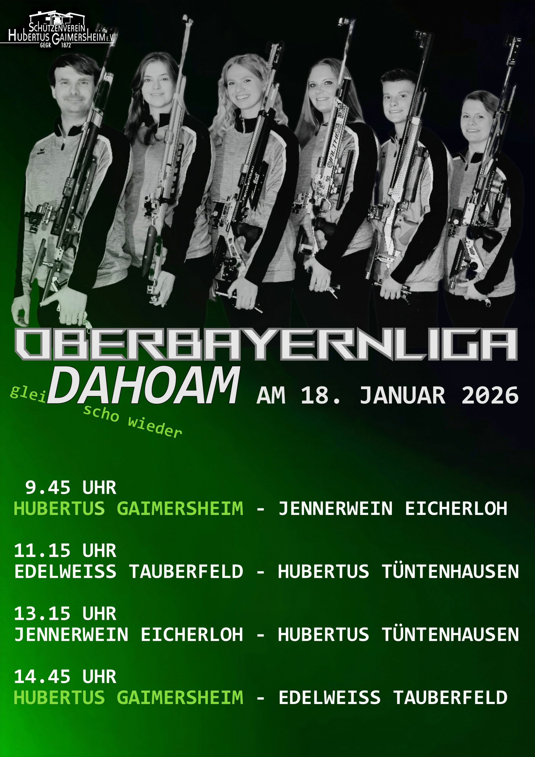 bereits am 18. Januar 2026 findet für unsere 1. Luftgewehrmannschaft in der Oberbayernliga der 2. Heimkampf statt – und dazu möchten wir schon jetzt alle Schießsportbegeisterten recht herzlich in unser Schützenhaus einladen