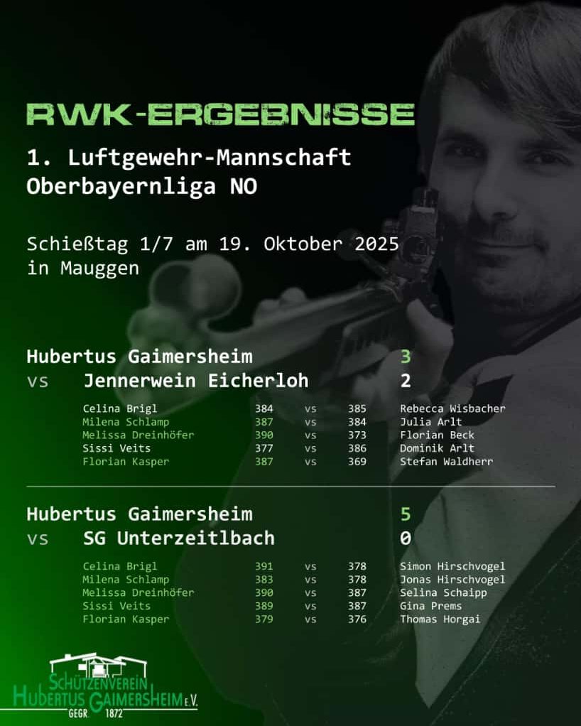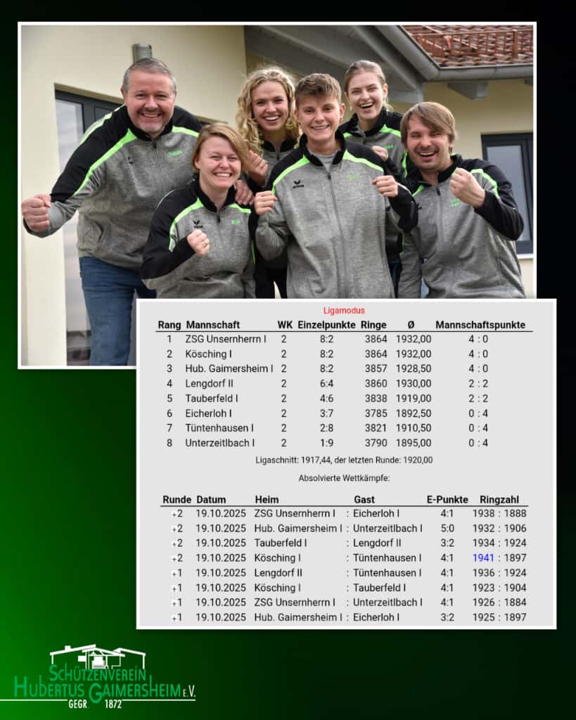 Dank der beiden Siege findet man sich in der Tabelle mit 8:2 Einzel- und 4:0 Mannschaftspunkten auf dem 3. Platz wieder. Am zweiten Wettkampftag am 2. November ist man zu Gast bei den Schützen von der ZSG Bavaria Unsernherrn. Dort geht es dann gegen Edelweiß Tauberfeld und Hubertus Tüntenhausen!