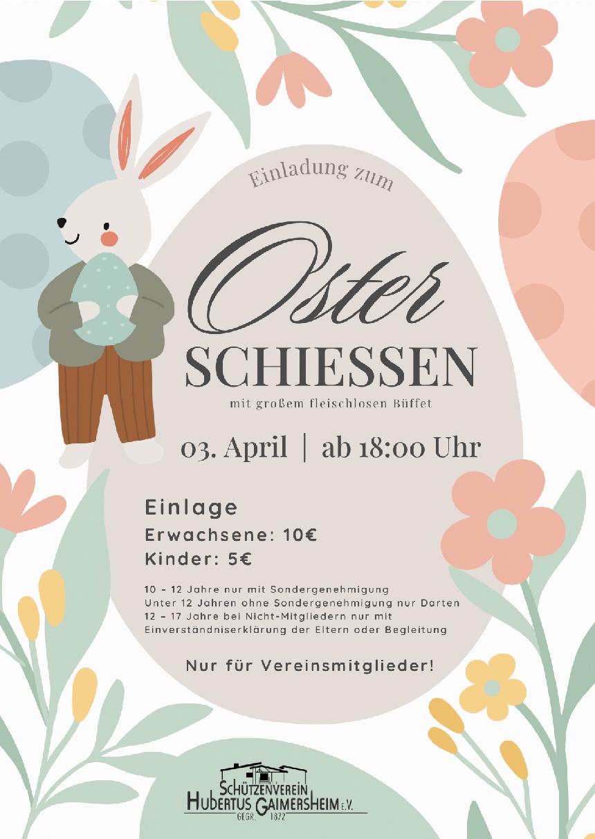 « Alle Veranstaltungen 03.04.2026: Osterschießen 3. April @ 6:00 p.m. – 10:00 p.m. Einladung zum Osterschießen Zum Kalender hinzufügen Google Kalender iCalendar Outlook 365 Outlook Live