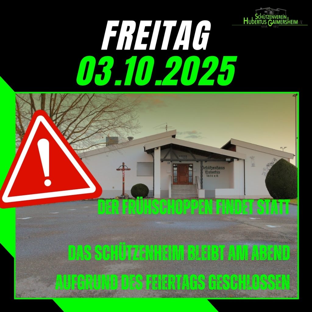 « Alle Veranstaltungen Diese Veranstaltung hat bereits stattgefunden. 03.10.2025: Schützenheim am Abend geschlossen (Feiertag) 3. Oktober @ 1:00 p.m. – 11:00 p.m. Zum Kalender hinzufügen Google Kalender iCalendar Outlook 365 Outlook Live