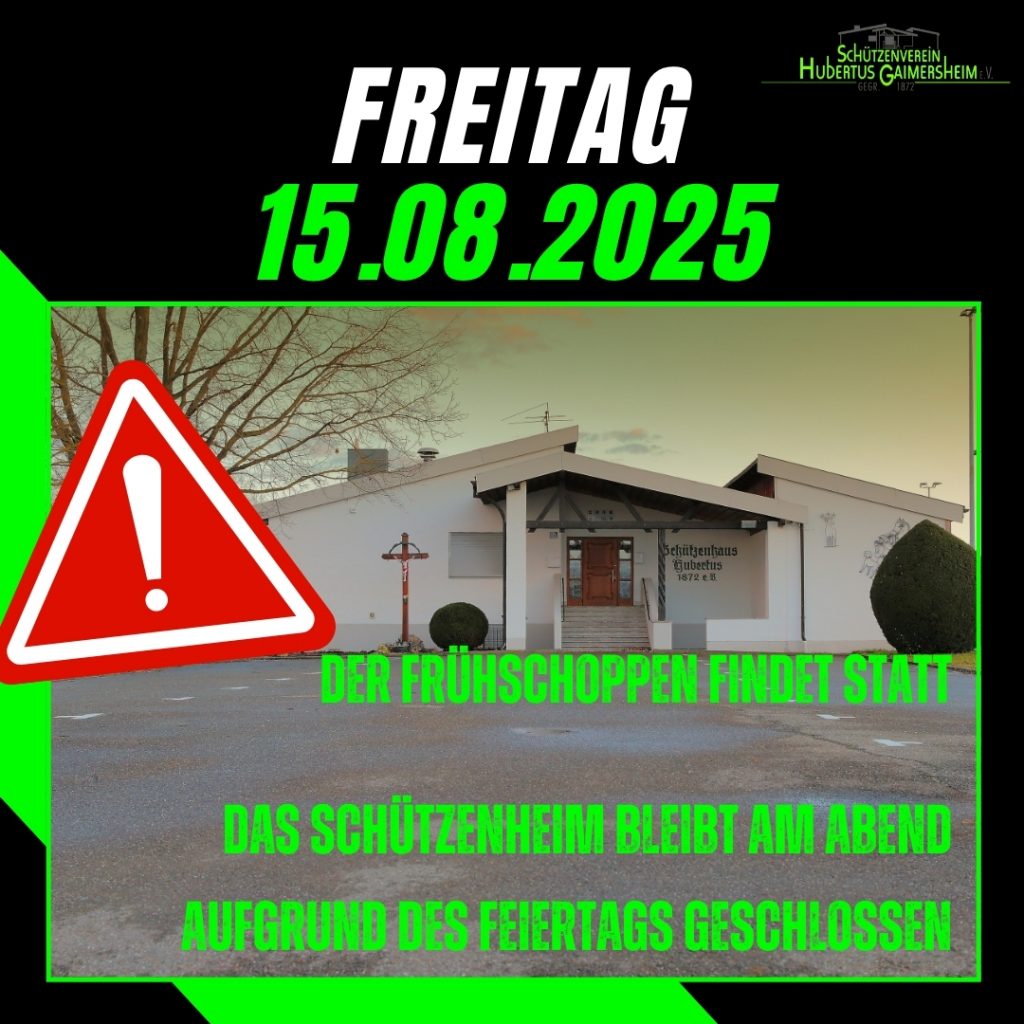 « Alle Veranstaltungen Diese Veranstaltung hat bereits stattgefunden. 15.08.2025 Schützenheim geschlossen 15. August @ 8:00 a.m. – 5:00 p.m. Zum Kalender hinzufügen Google Kalender iCalendar Outlook 365 Outlook Live