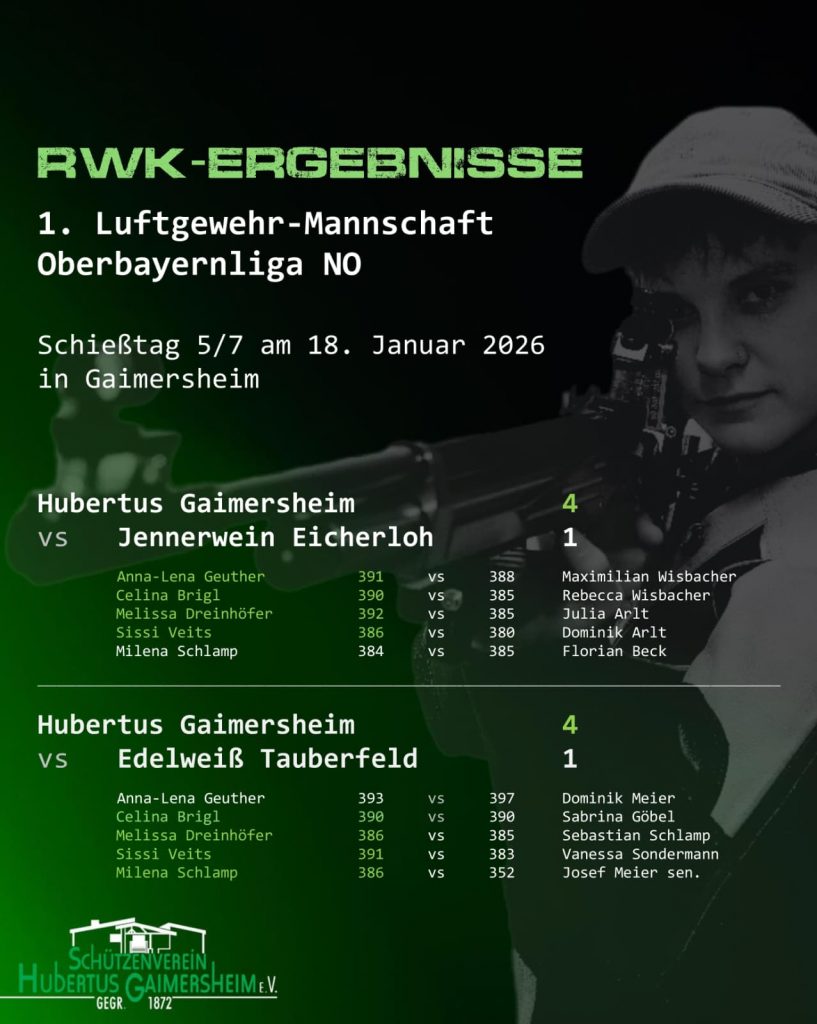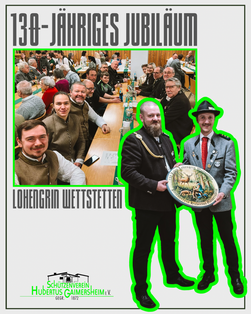 Unser Vereinsleben 2026 14.02.2026: Trainingstag in Aich 08.02.2026: Jahreshauptversammlung 24.01.2026: 130 Jahre Lohengrin Wettstetten 18.01.2026: Sebastiansmesse in Lippertshofen 18.01.2026: Heimkampf der 1. Luftgewehr Mannschaft 04.01.2026: Heimkampf der 1. Luftgewehr Mannschaft